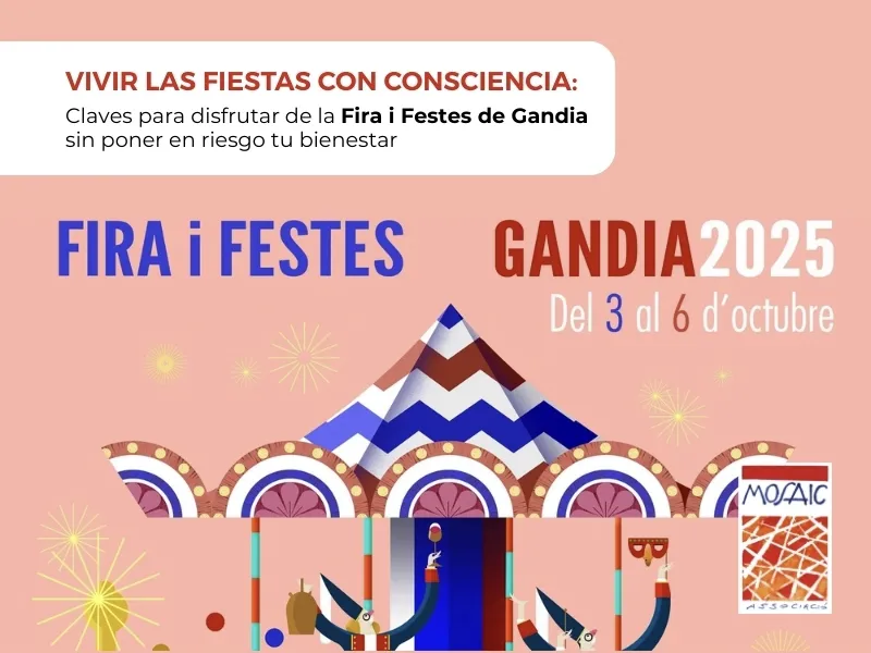 La Fira i Festes de Gandia es uno de los eventos más esperados del año en la comarca de La Safor: música, cultura, tradición y reencuentros. Pero para muchas personas en proceso de recuperación de una adicción, estas fiestas pueden suponer un reto. Desde Mosaic compartimos consejos, reflexiones y alternativas para disfrutar de la Fira con conciencia, libertad y sin poner en riesgo tu bienestar emocional. Porque sí, se puede vivir la fiesta de otra manera.